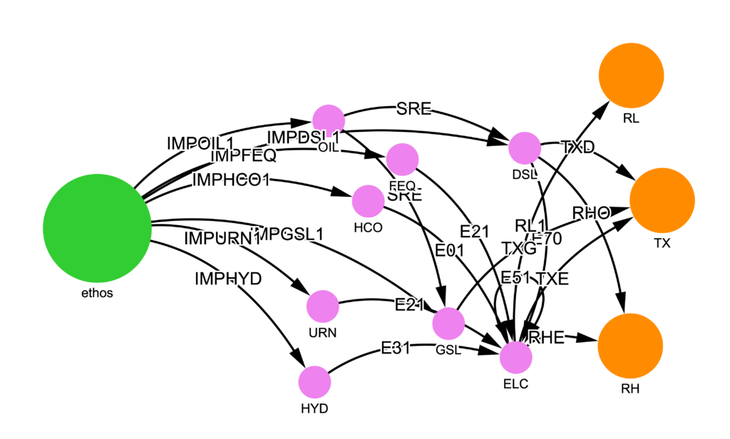 Connectivity in tabular format forms the basis of complex networks in TEMOA. Visualizing the network aids in identifying network connectivity escapes and other problems.